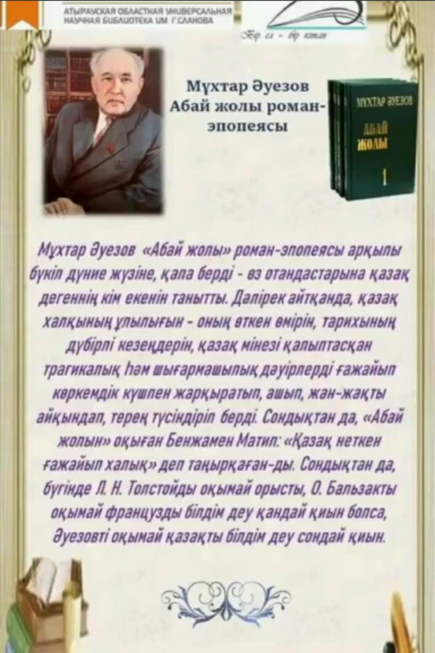 Ғ.Сланов атындағы облыстық ғылыми әмбебап кітапханасында қазақ халқының ұлы ақыны, ғұлама-ойшылы, композиторы, аудармашы Абай Құнанбаевтың туған күніне орай «Абай – дана, Абай – дара қазақта» атты кітап көрмесі жасақталып, тікелей эфир арқылы әлеуметтік желі пайдаланушылары назарына ұсынылды. Көрмені кітапханашы Байешева Ғалия таныстырды. Ұлы Абайдың 1945 жылы Мәскеуде жарық көрген кітабынан бастап, қазіргі уақытқа дейінгі кітаптары туралы ақпарат берді. Абайдың 175 жылдығына жазушы Роллан Сейсенбаевтың қолдауымен «Халықаралық Абай клубы» баспасынан шыққан 10 томдық шығармалар жинағы таныстырылды.