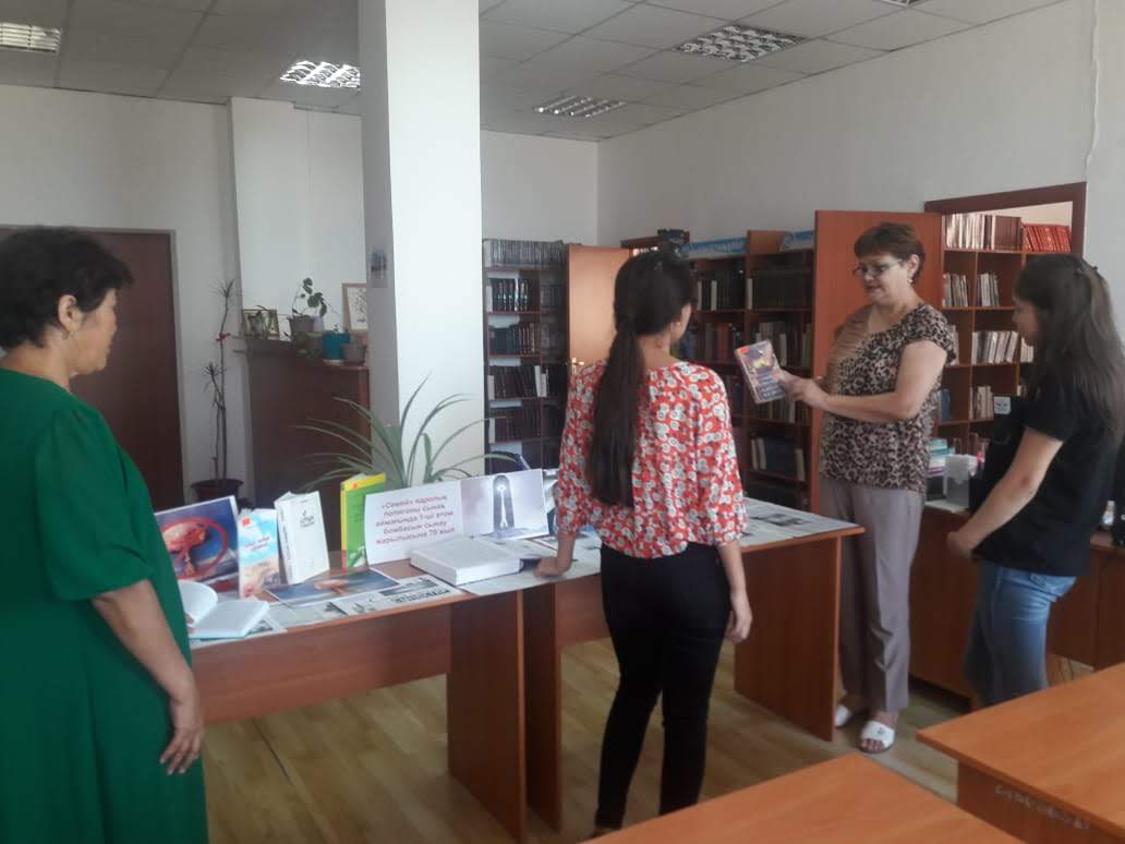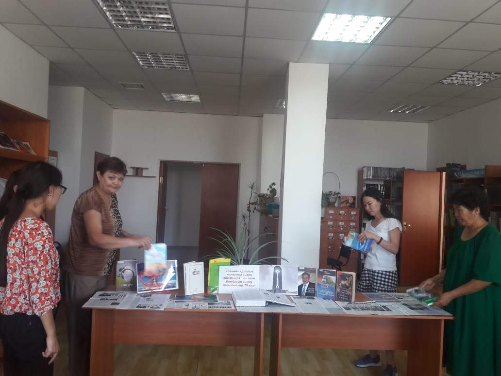 В областной универсальной научной библиотеке имени Г.Сланова оформлена выставка периодических издании к 70 летию первому испытательному взрыву ядерного полигона Семипалатинска. В ходе библиографического обзора библиотекарь к вниманию читателей предоставила книгу К.Бозтаева о создании, о проделанных работ, об истории закрытия Семипалатинского полигона «Семей полигоны», «Қайнар қасіреті» («Қазақстан», 1997), также книги охватывающие сведения о ядерной физике, ядерной энергетики, об атомной оружии, о радиоактивности и о его источниках, об их опасности С.А.Татамбаева «Атом империясының радиоактивті мұрасы немесе радиациялық экология» («Қайнар», 2008), Н.Назарбаева «Бейбітшілік кіндігі» («Елорда», 2001), С.Хамиева «Азғыр-Нарын-Тайсойған» (Атырау, 2008) и другие.