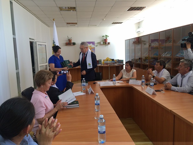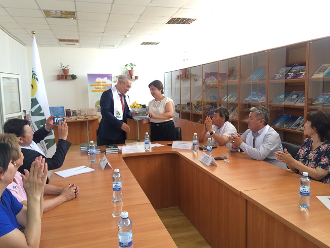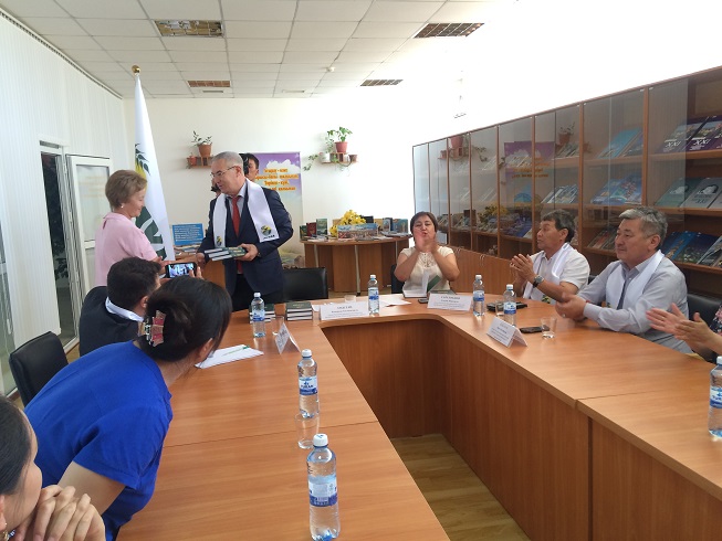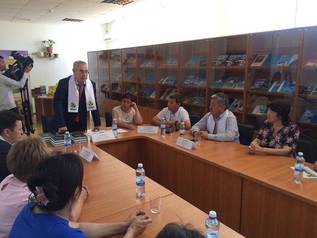 Председатель Атырауского областного филиала народно –демократической партий «Ауыл» К.Б.Арыстан «Ауыл» данную новую книгу выпущенной издательством «Нұрлы әлем», торжественно выручил заместителю директора ОУНБ имени Г.Сланова М.Л.Даулеткалиевой.