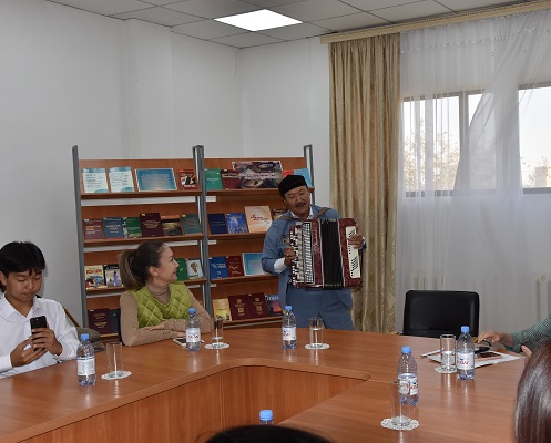 В течение вечера артист играл на домбре и пел народные песни под баян. От имени коллектива директор библиотекой Измуханбетова Сара Салахединовна вручила Жырау Турлану Бисенбаеву благодарственное письмо и книгу.
