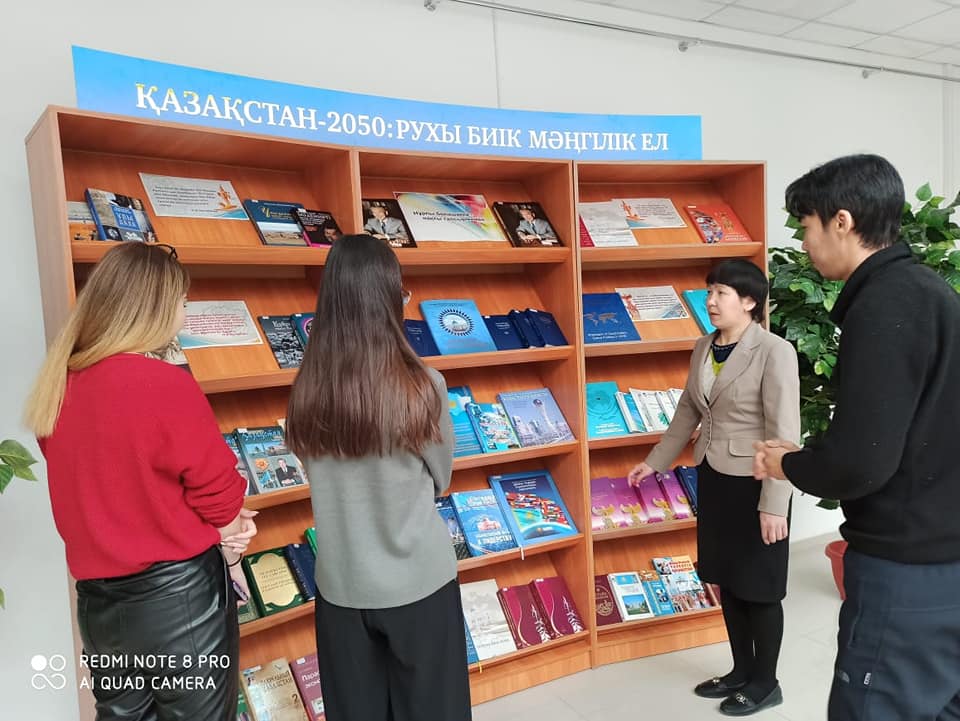 Ғ.Сланов атындағы облыстық ғылыми әмбебап кітапханада «Қазақстан-2050: Рухы биік Мәңгілік ел» атты атты кең көлемде кітап көрмесі жасақталып, оқырмандар назарына ұсынылды. Кітапханашы Айбарша Рахметова оқырмандарды кітап көрмесімен таныстыра отырып, «Сарайшық», «Ахмет Яссауи кесенесі» (2011), сияқты халыққа кеңінен танымал орындар туралы кітаптар, Қазақстанның мәдени құндылықтарын дәріптейтін, өзіндік мазмұны бар ескерткіштер туралы Ж.Бейсенбайұлының «Ұлы даланың ежелгі тарихының этномәдени төркіндері» (2017), «Мәңгілік ел - Қазақстан» (2017), «Қазақстан халқының өнері» (2017), «Зергерлік өнер әлемі Т.1,2» (2017), Н.Назарбаевтың «Мәңгілік ел. Ғасырға бергісіз жылдар» (2014), «ХХІ ғасыр әлемі» (2013), «Қазақстан Тәуелсіздігінің қалыптасу тарихы» (2008) атты кітаптардағы мәліметтерді әңгімесіне арқау етті.