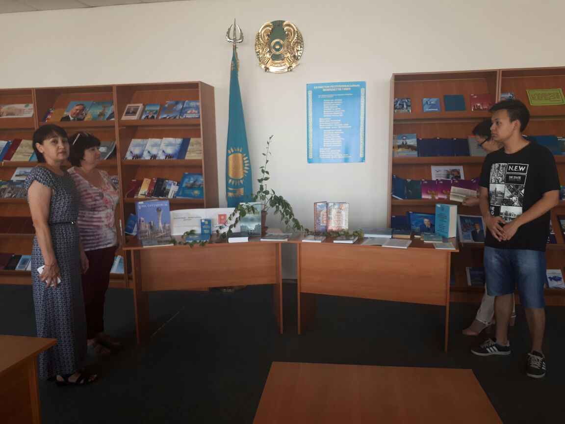 Библиотекарь Анар Тусаева в ходе ознакомления с книжной выставки к вниманию читателей представила книги охватывающие об основных функции и об особенностях действующих законов в республике: «Қазақстан Республикасының Конституциясы», К.Омарханова «Қазақ елінің дәстүрлі құқығы», Ж.О.Артыкбаева «Жеті жарғы» - мемлекет және құқық ескерткіші», «Қазақтың ата заңдары», С.Сартаева «Ар мен дар алдындағы сөз», У.Копабаева «Ата заң – мемлекет дамуының іргетасы», «Ғылымдағы ғасыр абызы» (Академик Салық Зиманов), У.Акыпбекулы «Қара қылды қақ жарған», К.Еламанова «Шаңырақ пен пырақ», Г.Сапаргалиева «Конституционное Право Республики Казахстан», «Конституционные законы Республики Казахстан», А.К.Абельдинова «Конституционное право зарубежных стран» и другие.