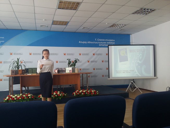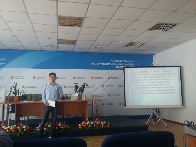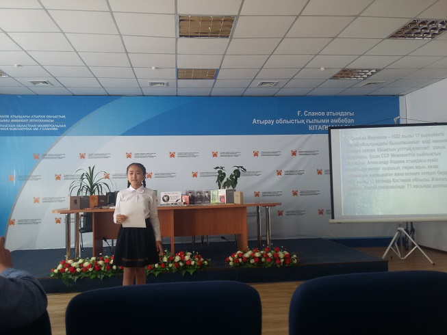 13.09.17 г.В областной универсальной научной библиотеке имени Г.Сланова проведен вечер поэзии на тему: «Өмір жолы- өлең өрісі», посвященная к 95 летию со дня рождения поэта, Народного писателя Сырбай Мауленову, с целью вести дискуссию о поэзии, о творчестве поэта, пропагандировать произведения юбиляра. В мероприятии участвовали учащиеся 6 класса средней школы №2 Талгатова Инкар, учащиеся 10 класса школы –гимназии «Дарын» Салауатов Ислам, учащиеся 11класса средней школы №4 Кайратова Жаннур, учащиеся 9 класса средней школы №11 Абаева Асемгул, а также постоянные читатели библиотеки и библиотекари. Библиотекарь Оразбаева Балауса ознакомила присутствующих с биографическими данными и с творчеством поэта. В ходе мероприятии библиотекарь вела библиографический обзор по одноименной книжной выставке. В конце мероприятии учащиеся читали