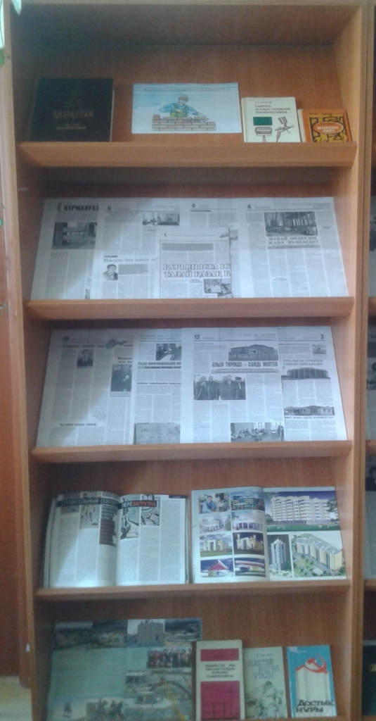 К вниманию читателей на выставке были представлены литературы охватывающая о професии строителя «Қазақстан ұлттық энциклопедиясы» (2004), Е.Белоусова «Сырлау жұмыстарының технологиясы» (1988), А.Оспанова «Шеберлікке үйрен» (1976), С.Хамзина «Үймереттер мен ғимараттардың құрылыс технологиясы» (1994), К.Орынбаева «Есептей білген ұтады» (1988), К.Мынжанова «Достық нұры» (1981)и статьи из периодической печати.
