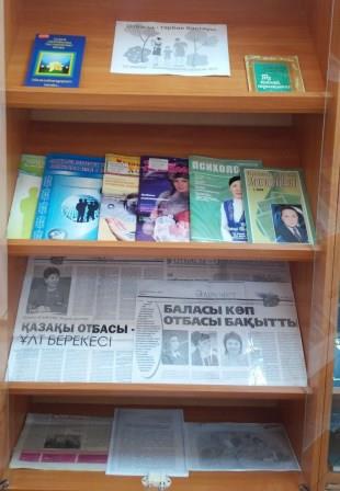 На выставке были представлены книги Х.Аргынбаева «Қазақтың отбасылық дәстүрлері», «Қазақ отбасы» (1996),К.Жарыкбаева и А.Табылдиева «Әдеп және жантану» и др. К вниманию читателей также были представлены материалы из периодической печати: статья Г.Ахметова «Отбасының бала тәрбиесінде алатын орны» из журнала«Қызықты психология» (№1,2015),А.Г.Сыдыкова «Отбасы және мектеп» из журнала«Жанұя мен мектептегі тәрбие» (№2, 2011), М.А.Ауелбай «Отбасы тәрбиесі – рухы биік, қуатты мемлекет негізі» (№1,2011), Б.Карсыбаева «Отбасылық өмірге дайындау» («Қазақстан мектебі» №1, 2009), С.Бапаева «Отбасы психотерапиясы» из журнала «Қызықты психология» (№6, 2011). Ж.Оралбаева «Кешегі бозбала мен бойжеткен бүгінде салиқалы азамат, ардақты ана» («Егемен Қазақстан» 13 қыркүйек, 2014 ж.), Оразкүл Асангазының «Қазақы отбасы – ұлт берекесі» («Айқын»№43, 2013) и другие.